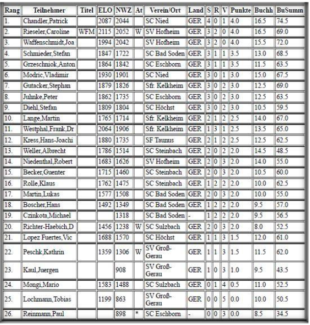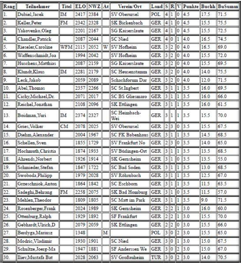 Zum Turnierverlauf: Am Ende konnte sich der Vorjahressieger IM Jacek Dubiel vom SV Oberursel erneut den Turniersieg holen und somit erfolgreich seinen Titel verteidigen. Doch dahinter konnten wir die eine oder andere Überraschung erleben. Die Spieler aus der zweiten Reihe gaben erfreulicherweise mächtig Gas und machten es den Titelträgern durch couragiertes Spiel teilweise recht schwer. Zumeist konnten diese am Ende zwar den Kopf aus der Schlinge ziehen und den vollen Punkt für sich verbuchen, der eine oder andere musste jedoch ungeplante Punktverluste erleiden und fand sich in der Abschlusstabelle auf einem Platz weit hinter seinen Erwartungen wieder.