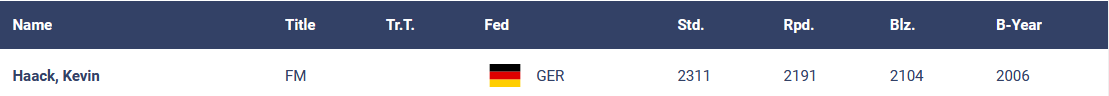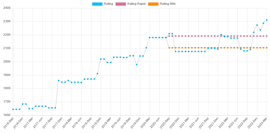 Kevins Chart zeigt, den Verlauf seines Ratings in den vergangenen Jahren. Gut zu sehen ist auch der Sprung im November 2022, der aus der überragenden Leistung bei den MTS-Einzelmeisterschaften herrührt. Den entscheidenden Sprung über die 2300er Marke erzielte Kevin beim Oberligakampf von Hofheim 2 am 26. Februar in Schöneck. Im Duell am Spitzenbrett gegen IM Michal Konopka gelang ein Sieg und der entscheidende Elo-Sprung (+ 24) über 2300.